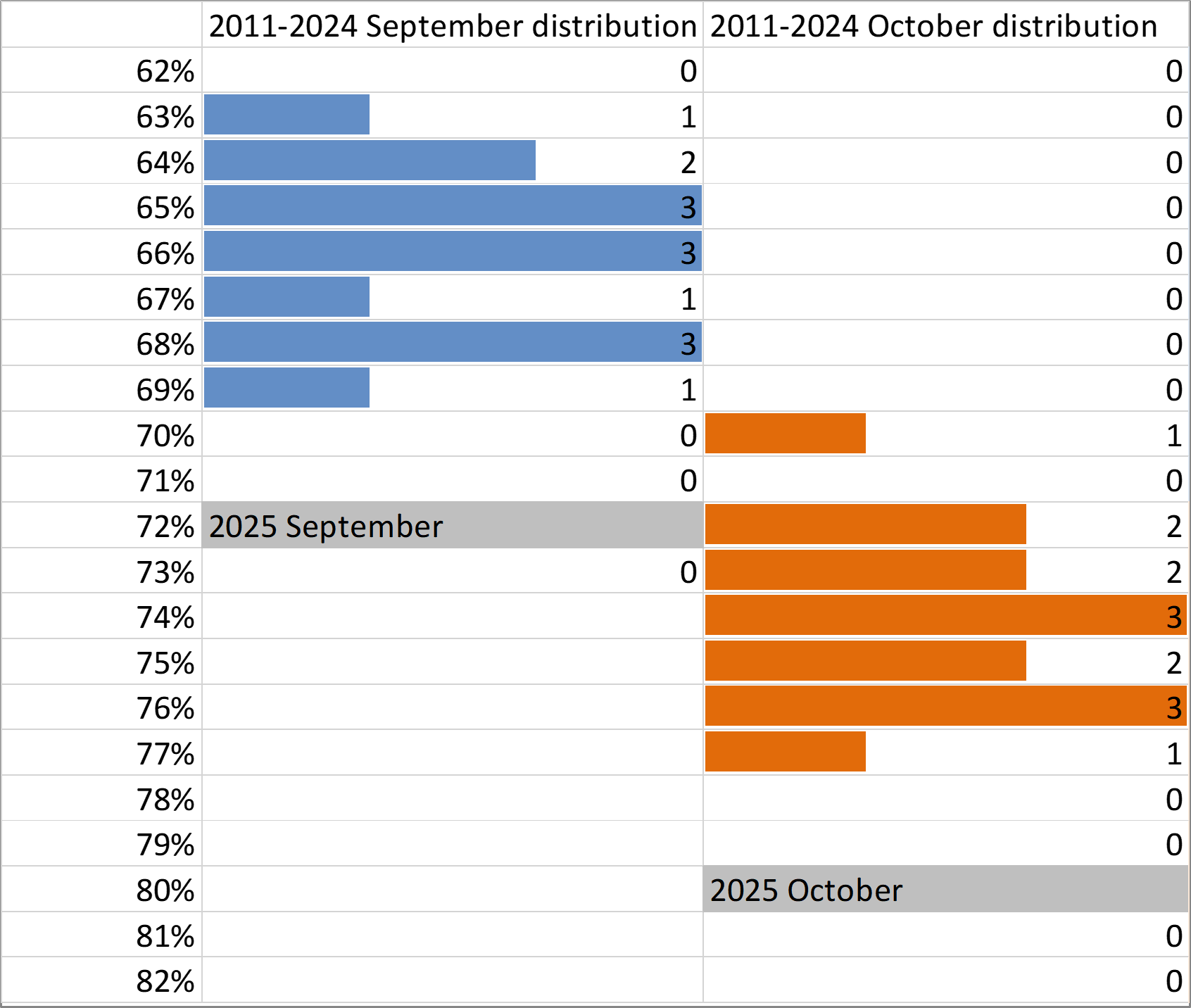 If the Russian budget execution from 2011 to 2024 is any indication, the normal levels of execution are 66% in September and 74% in October. Russian budget spending is 6% too fast. Below is a graph showing the historical percentages for September (blue) and October (orange) spending. The bars indicate the number of years in which execution was at the percentage level shown on the left.