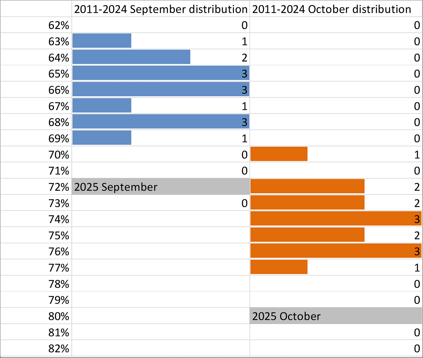 As you can see in the table, if the total for 2025 were actually only 42.8 trillion, the values for September and October of that year would be highly unusual. September and October of 2025 would fall far outside the historical distribution. Looking at these numbers, it seems much more likely that the total for 2025 will be higher, shifting the percentages for September and October somewhere closer to the historical distribution.